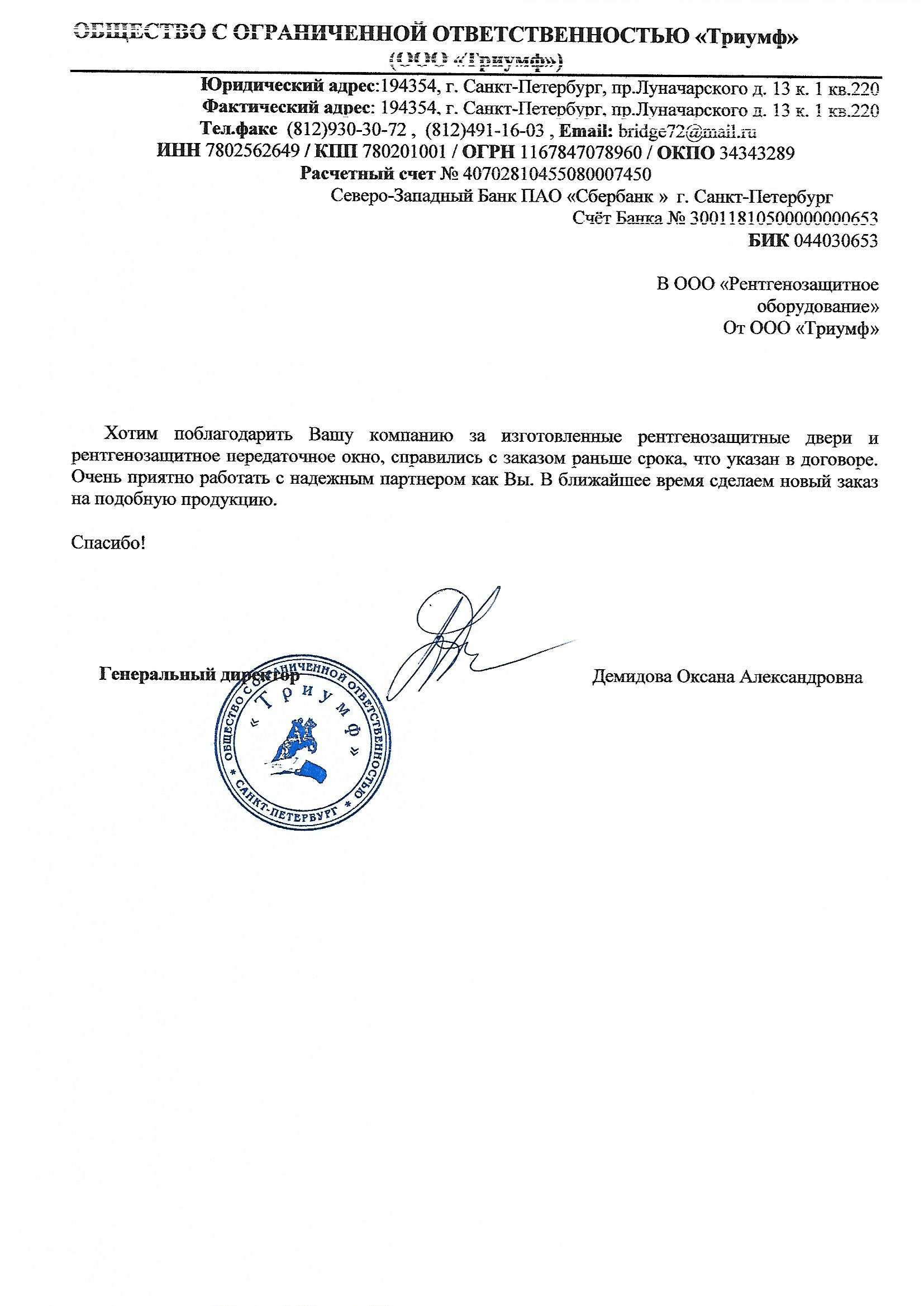 Хотим поблагодарить Вашу компанию за изготовленные рентгенозащитные двери и рентгенозащитное передаточное окно, справились с заказом раньше срока, что указан в договоре.