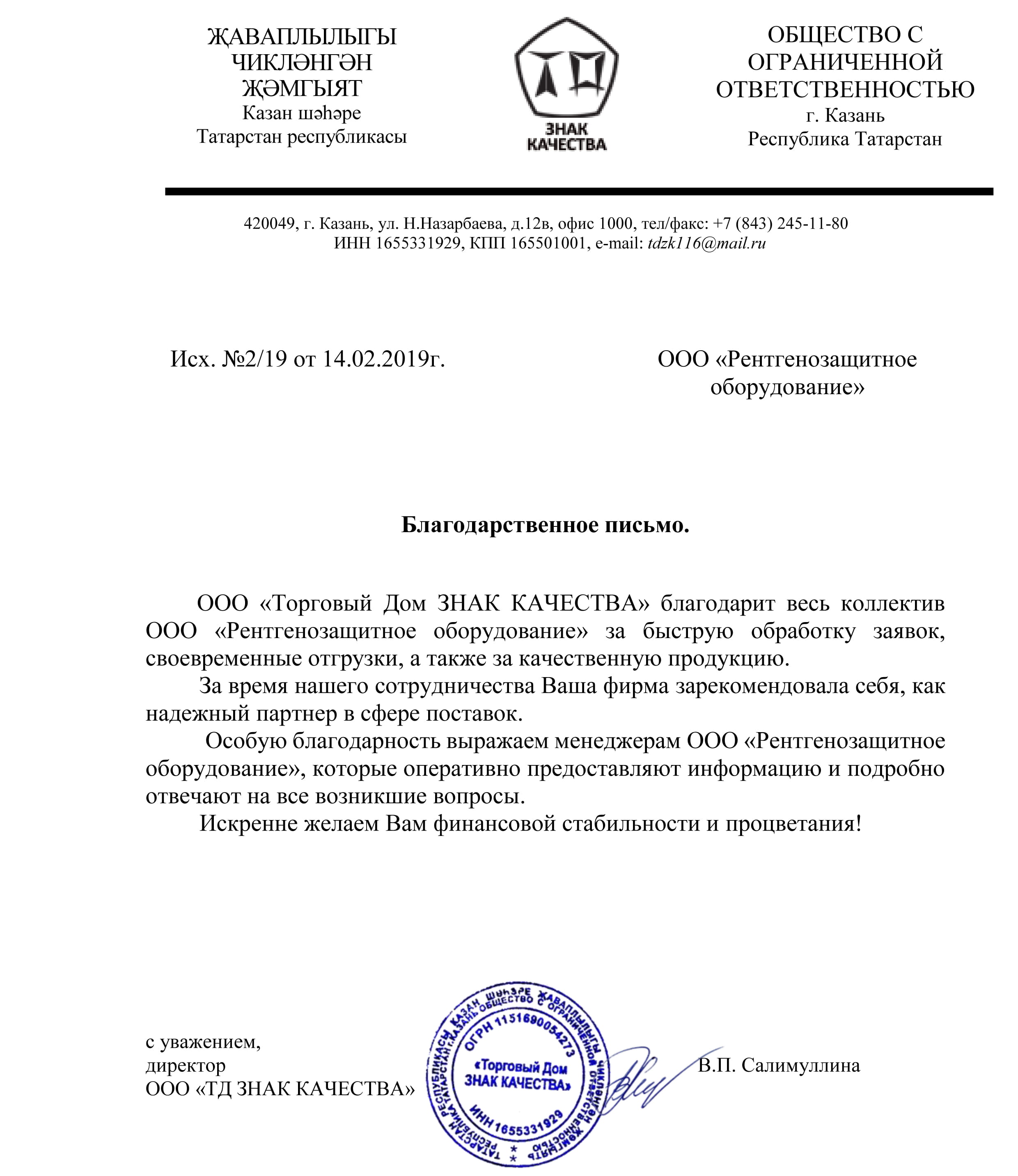 ООО «Рентгенозащитное оборудование» за быструю обработку заявок, своевременные отгрузки, а также за качественную продукцию.