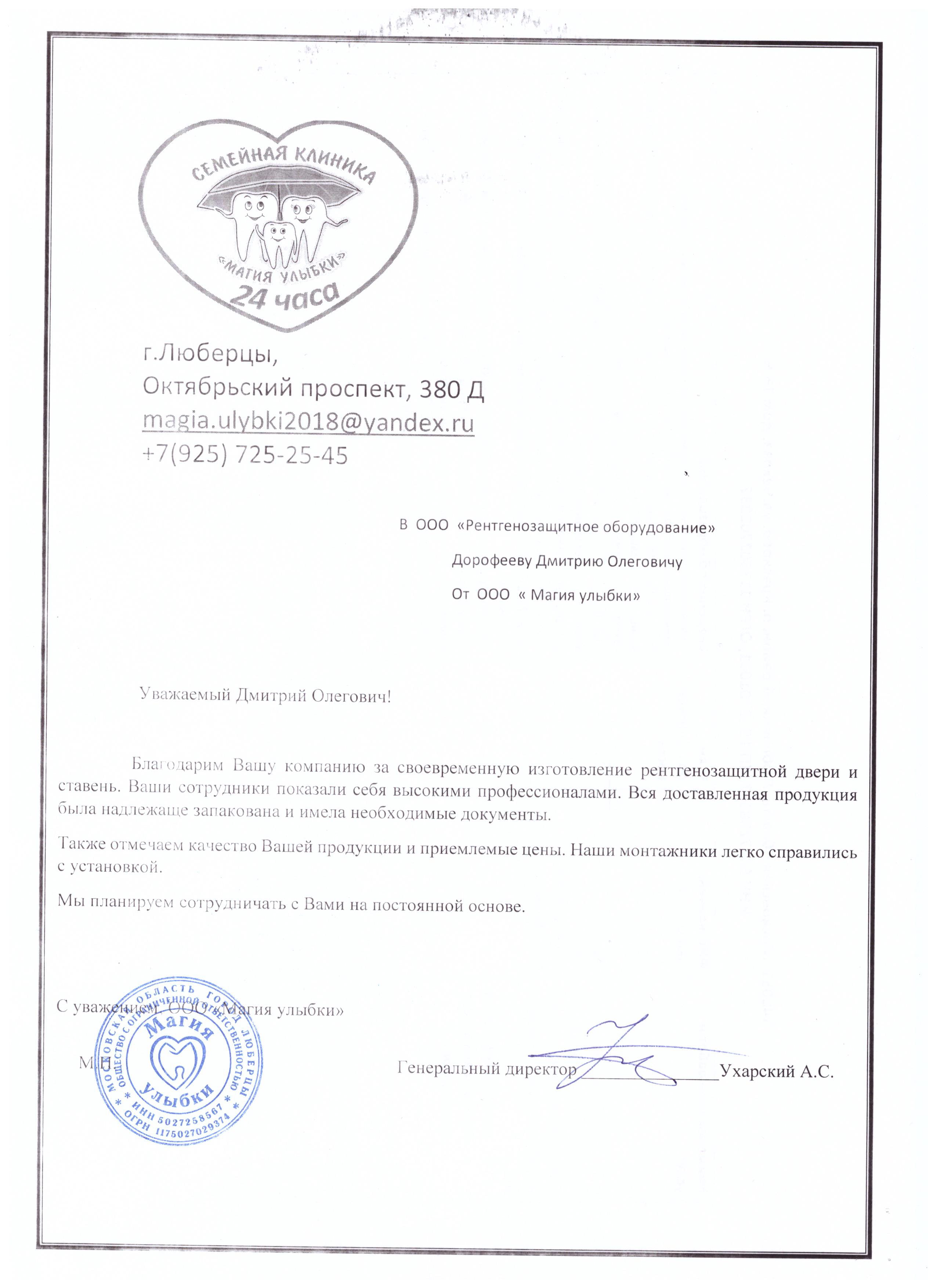 Благодарим Вашу компанию за своевременную изготовление рентгенозащитной двери и