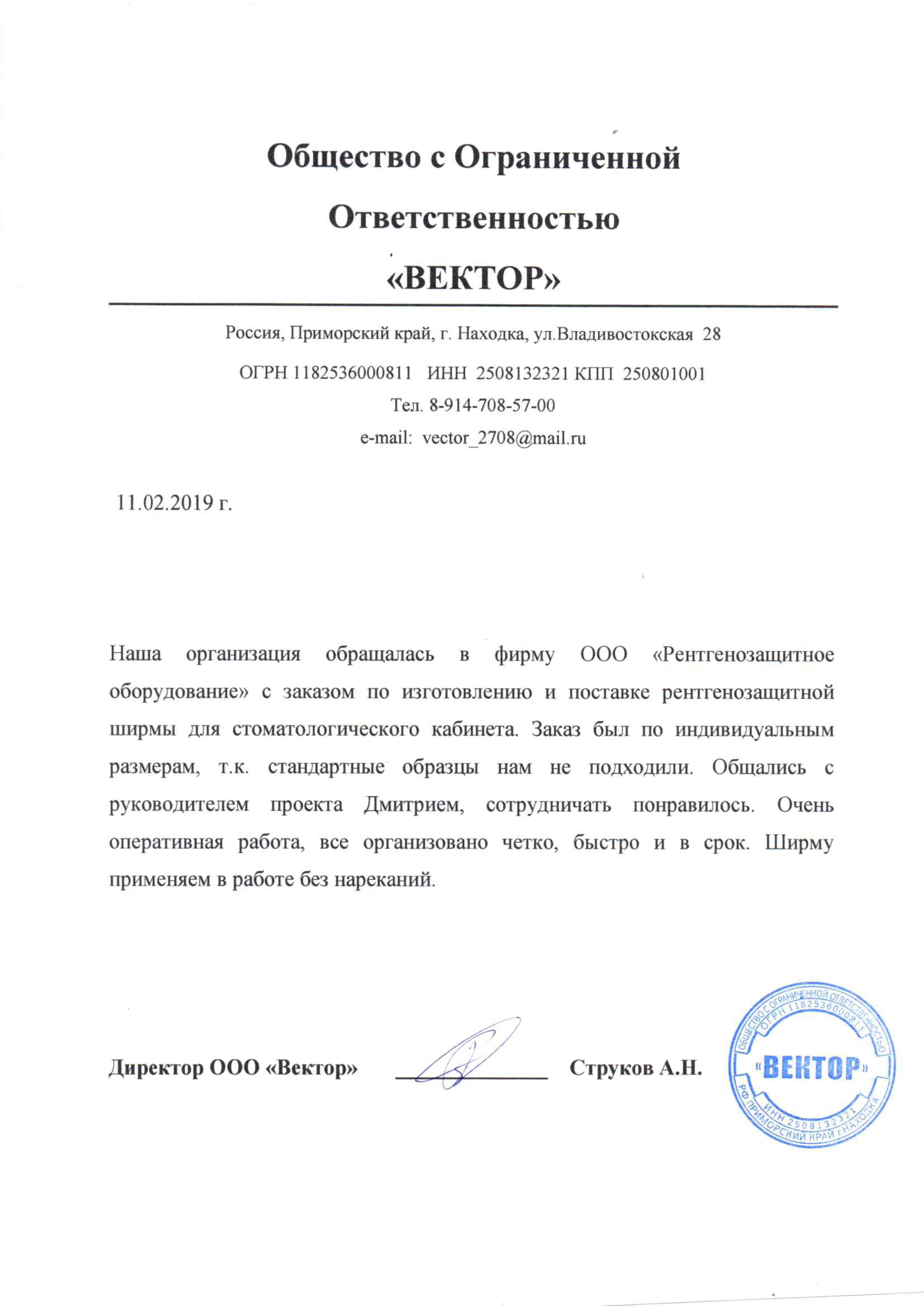 оборудование» с заказом по изготовлению и поставке рентгенозащитной ширмы для стоматологического кабинета. Заказ был по индивидуальным размерам, т.к. стандартные образцы нам не подходили. Общались с руководителем проекта Дмитрием, сотрудничать понравилось. Очень оперативная работа, все организовано четко, быстро и в срок. Ширму применяем в работе без нареканий.